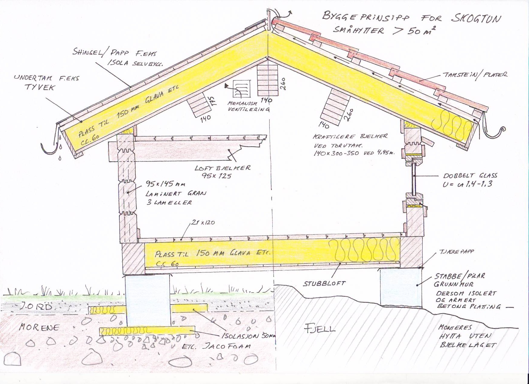 Hyttene er isolert med 15cm isolasjon i gulv og tak. Vinduer og dører har bolighuskvalitet med 2 lags glass og ekte sprosser. Selve hytta er bygget av 9,5cm ( eventuelt 12cm ) tykke laminerte bjelker som er 14,5cm høye og har 3 styrespor (not og fjær) som hindrer vindgjennomtregning. Det at bjelkene er laminerte - dvs. limt sammen av 3 deler gjør at bjelkene ikke vrir seg og blir vanskelig å montere. Lamineringen hindrer også sprekkdannelser i hytta med påfølgende varmetap og stygge overflater.
