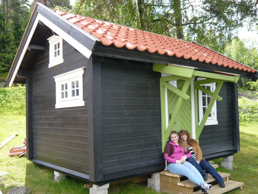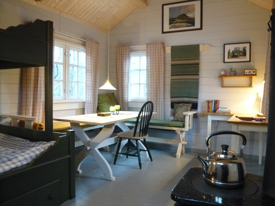 .Skogtun 15 er en liten, men innredet som på bildet er den jo godt egnet som anneks ved hytta eller huset, jaktkoie på vidda eller ved fiskeelva eller skrivestue/kontor ved huset. Inredet som vi har vist her kan 4-5 personer spise hvile og overnatte. Vi kan om ønskelig spesialvarianter med andre typer vinduer , tildels annen rommindeling osv.